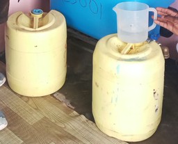 Ohne den AQQAcube (Bild oben) wird entweder das kontaminierte Wasser aus den natürlichen Quellen direkt getrunken oder von Wasserlieferanten erworben. Diese verkaufen Wasser in sogenannten Jerrycans (Bild unten).